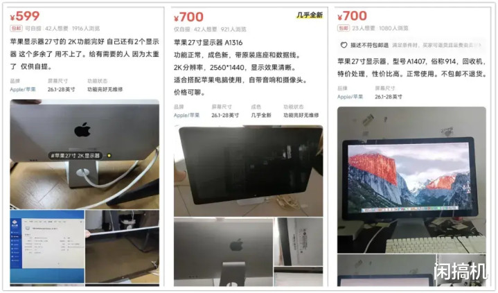 这周我怼着二手苹果去写,结果写成了全家福,今天再写下苹果显示器收尾吧。在查小黄鱼的过程中,我发现这玩意价格乱七八糟,既有大量商家的统货,也有很多个人的闲置货,咱就抽丝剥茧去聊聊。